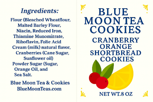 - Ingredients: Flour (Bleached Wheat flour, Malted Barley Flour, Niacin, Reduced Iron, Thiamine, Mononitrate, Riboflavin, Folic Acid, Butter (cream, (milk) natural flavor), Cranberries (Cane Sugar, Sunflower oil, Powder Sugar (Sugar, Cornstarch), Orange Oil, and Sea Salt.